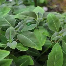 叶对生,茎端的2对(其中1对常缩小成苞片状)密聚,呈轮生状,叶片阔卵形或近圆形,极少近椭圆形,长1.3-3.8厘米,宽8-30毫米,先端钝圆、圆形或有时微凹,基部宽截形,稀为楔形,草质而稍厚,上面绿色,下面粉绿色,两面密布具节糙伏毛,边缘透光可见透明粗腺条,中肋稍宽,在下面微隆起,侧脉不明显;叶柄长约为叶片的一半或与叶片近等长,密被柔毛。