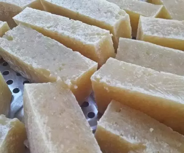 冻豆腐400克,面粉30克,熟猪油100克,水淀粉30克,花椒水40克,鸡油40克,料酒20克,精盐5克,姜30克,味精2克,葱30克