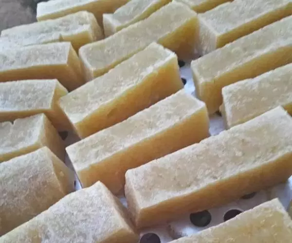 2.此菜是将冻豆腐用凉水化出冰渣,切长方片,再加调味品扒制,质地酥软爽口,味香且厚,深受食者喜爱。