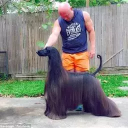 阿富汗猎犬全身披丝绢状的长毛,毛色鲜艳,呈多种颜色,背中线附近毛短,…