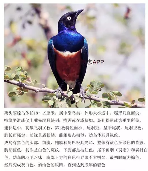 栗头丽椋鸟体长18~19厘米,属中型鸟类,体形大小适中。嘴形几直而尖,嘴缘平滑或仅上嘴先端具缺刻;…