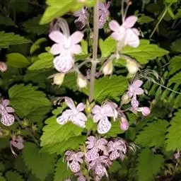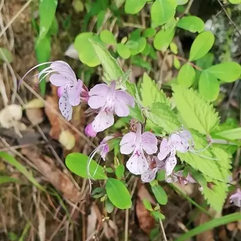 二歧聚伞花序腋生,花序梗长2-3-(11)厘米,疏被柔毛,苞片披针形至线形;花萼杯状,外面被柔毛,长2-4毫米,结果时增大近一倍,顶端5浅裂,裂齿三角形,长约0.6-1毫米;花冠紫色或红色,长1-2厘米,外面被疏毛,喉部疏生柔毛,顶端5裂,裂片全缘,下唇中裂片较大,花冠管长约1-1.5厘米;雄蕊4枚,与花柱均伸出花冠管外;子房无毛,有或无腺点。蒴果黑棕色,4瓣裂,无毛,无翅,有网纹。花期7-8月,果期8-9月。