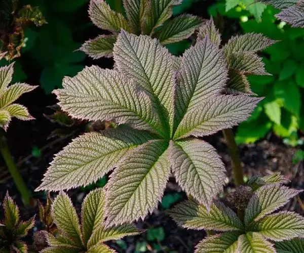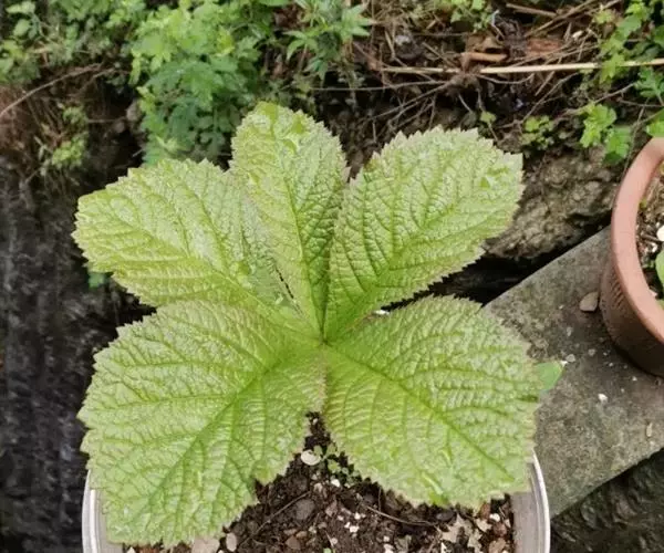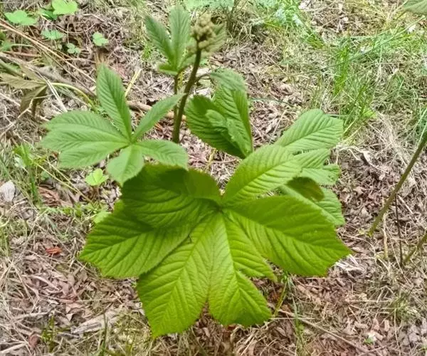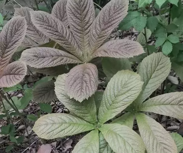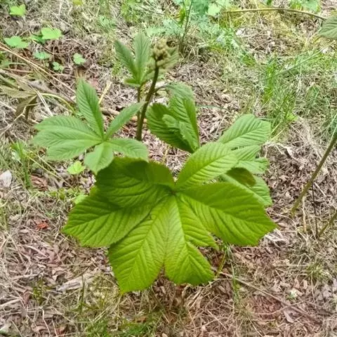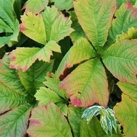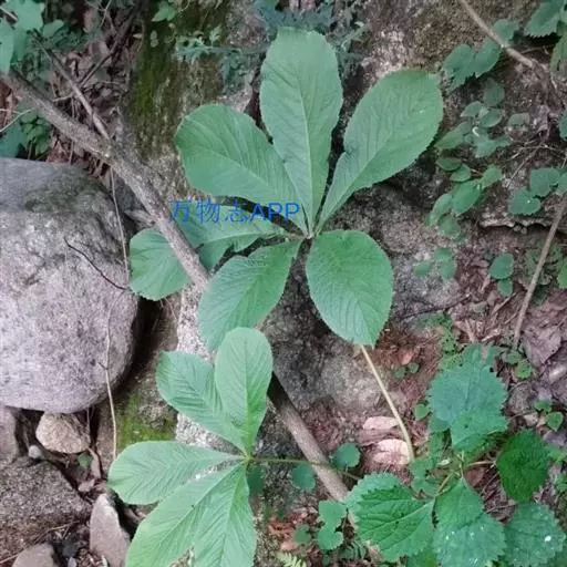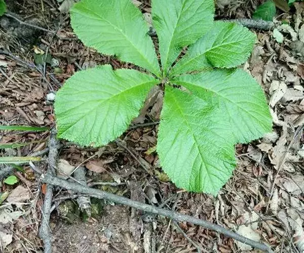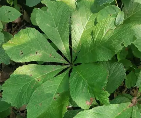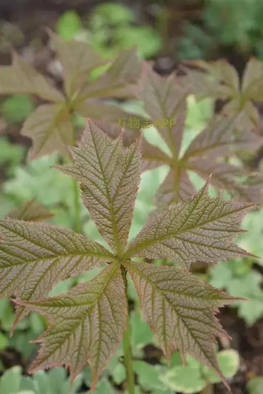 多年生草本,高0.6-1米。根状茎粗壮,横走。茎无毛。基生叶少数,具长柄,为掌状复叶,小叶片5(-7),近倒卵形,长15-35厘米,宽10-25厘米,先端3(-5)浅裂,裂片顶端渐尖,边缘有粗锯齿,腹面无毛,背面沿脉疏生柔毛;叶柄长15-30厘米,疏生柔毛,基部扩大呈鞘状,边缘具长睫毛;茎生叶互生,较小。圆锥花序顶生,长15-30厘米,多花;花梗和花序轴均密被鳞片状毛(有时具腺头);萼片7-5,白色,近卵形,长约2.1毫米,宽约1.1毫米,先端渐尖,腹面无毛,边缘和背面疏生腺毛,具羽状脉,脉于先端不汇合;花瓣不存在;雄蕊通常10,长约4毫米;心皮2,下部合生,子房近上位,卵球形,长约1.5毫米,花柱长约1.3毫米。蒴果;种子多数。染色体2n=30。花期6-7月。