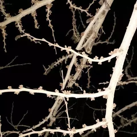 花白色,常下垂,直径约1.5厘米,2-7朵丛生于去年小枝的叶腋,先叶开放或与叶同时开放;花梗纤细,长5-8毫米;萼管倒圆锥形,高约3毫米,萼齿三角状披针形,长约2毫米;花冠4深裂,花冠管长10-15毫米,裂片倒卵形,长10-12毫米,宽约8毫米,边有缘毛;雄蕊8枚,4长4短,长短相间,长12-19毫米,花丝基部联合成管,花药长圆形,长约2毫米;花柱较花冠长,纤细,无毛。
