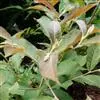 叶纸质,椭圆形、 银钟花 长椭圆形或卵状椭圆形,长5-13厘米,宽3-4.5厘米,顶端渐尖或钝渐尖,常稍弯,基部楔形,稀近圆形,边缘有锯齿,齿端角质红褐色,上面绿色,下面浅绿色,主脉上面下陷,下面隆起,嫩时常呈紫红色,嫩叶两面疏被星状毛,成长后无毛,侧脉每边10-24条,纤细,网脉细密,在两面均明显隆起;叶柄长5-10厘米。