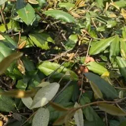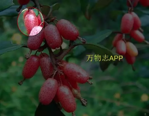 1.蔓胡颓子:又名藤胡颓子、抱君子、桂香柳。常绿蔓生或攀援灌木,高达6m。无刺,稀具刺;幼枝密被锈色鳞片。单叶互生;叶柄长5-8mm;叶片革质或薄革质,卵形或卵状椭圆形,长4-12cm,宽2.5-5cm,先端渐尖,基部圆形,全缘,上面绿色,光亮,下面灰绿色,被褐色鳞片。花密被银白色和散生少数褐色鳞片,常3-7朵密生于叶腋短小枝上成伞形总状花序;萼筒漏斗形,长4.5-5.5mm,裂片长2.5-3mm;雄蕊的花丝长不超过1mm;花柱细长,无毛,先端弯曲。果实长圆形,稍有汁,长14-19mm,被锈色鳞片,成熟时红色。花期9-11月,果期翌年4-5月。