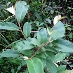 2.角花胡颓子:又名红面将军、土芋肉。本种与蔓胡颓子的主要区别点为:花单生,萼筒显著四角形(角柱状),裂片长3.5-4.5mm,网状脉在上面极明显,易于识别。