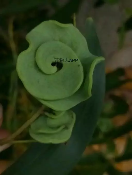 荚果初始平直,成熟时扭曲成圆环状, 荚果成熟时旋卷,长5-8厘米,宽8-12毫米,果瓣木质, 结种处略膨大。种子椭圆形,坚硬,黑色,有光泽,压扁,长约5毫米,种脐大,几乎闭合,新鲜种子具有同种脐连接的黄色脐带圈,易于分离脱落,采种后最少需要2个月贮存期来完成后熟生理过程。在澳大利亚,通常6-7月份(冬季)开花,8-10月份(冬春季节)可获得成熟种子。