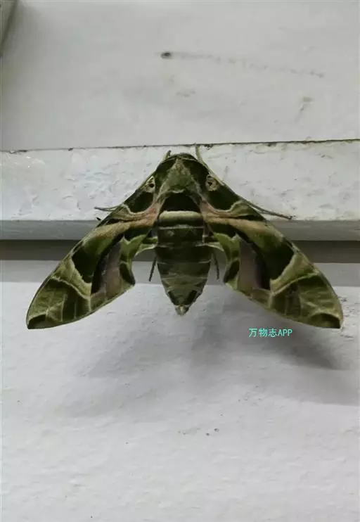 展翅80-90mm,体色底色灰绿色或橄榄绿,前胸背板有一枚八字型的灰白色斑纹,前翅中央有一条淡黄褐色的横带,与腹背的黄白色横斑于停栖时条纹相连,近翅端有一条斜向的浅色横带,近臀部有一枚灰褐色的暗斑,斑型达后缘。本种普遍分布于低海拔山区,幼虫寄主夹竹桃科的日日春、马茶花、夹竹桃等有毒植物,初龄体色绿色,腹端有一根黑色细长的尾突,终龄尾突橙色,胸背板上有一对框黑边的蓝白色拟眼大斑,各龄期体色多变,体型肥大,体侧有一条白色宽型纵纹,边缘具稀疏的白色斑点,化蛹前体色呈黑褐色,成虫常见于公园、学校及住家阳台,夜晚会趋光。