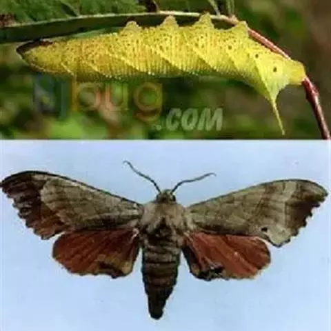 成虫青黑色,前翅基部灰白色,中央有1个黑点,中部至前缘有1个灰白色至青色、形似汤勺状斑纹,距顶角10毫米左右有1条灰白色纵线,翅中下部至外缘有1条淡红棕色宽带。幼虫青绿色,后胸两侧各有1个白色带紫边的唇形纹,第2腹节至末节两侧各有1条白色横带,横带两侧散生白色小点。尾角橙黄色,气门深紫色。