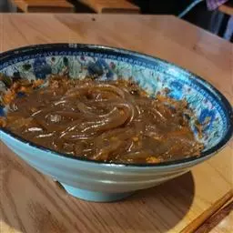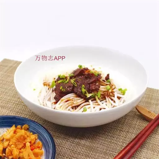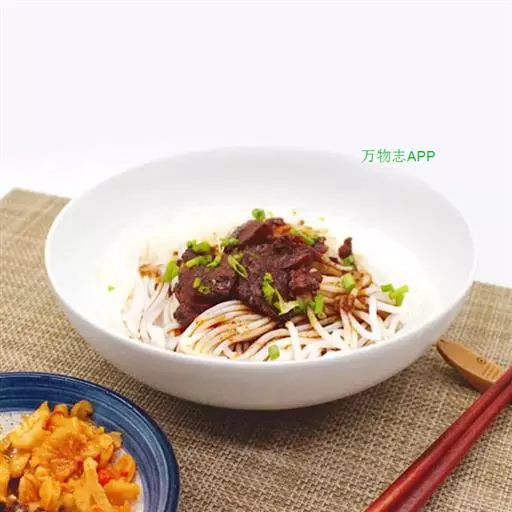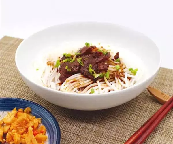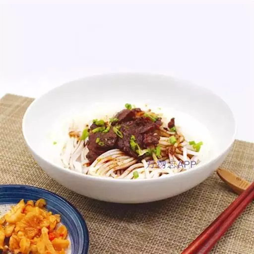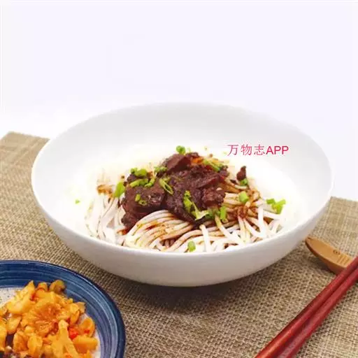 3、食用时按下列顺序操作:米粉(一般一碗牛肉粉约150克-200克)放入开水锅中烫透,捞入汤碗里,在米粉上铺上牛肉片(25克),盖上炖熟的牛肉丁(25克)或牛筋丁,放上适量的酸菜,加上少许牛油,最后浇上滚烫的原汤,洒上芫荽节即可。
