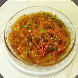 【配料】材料:米粉400克,酱牛肉50克,泡菜萝卜50克,黄瓜50克,水晶白梨50克,熟鸡蛋1个。调料:红椒20克,白糖50克,醋精20克,橙汁10克,精盐4克,味精4克,鸡粉5克,香油10克,酱油2克。