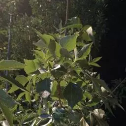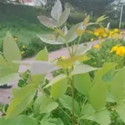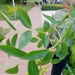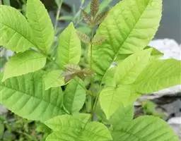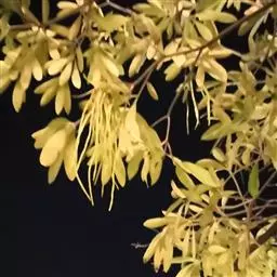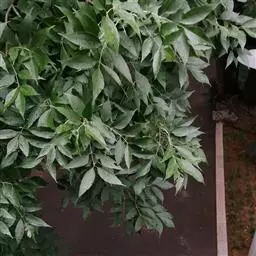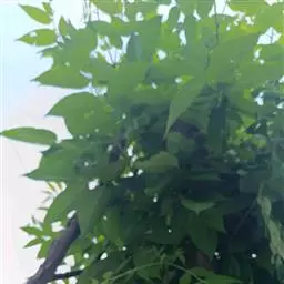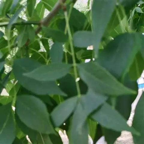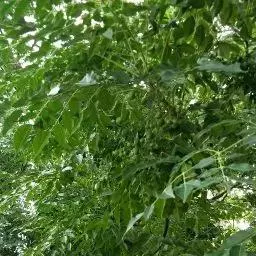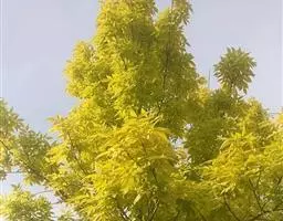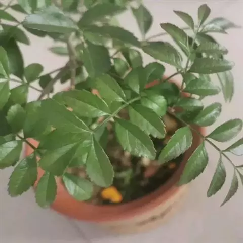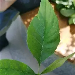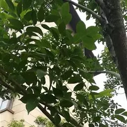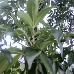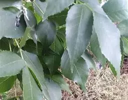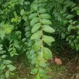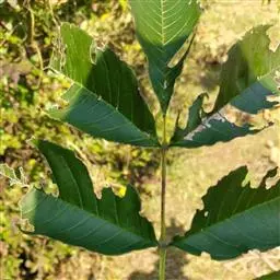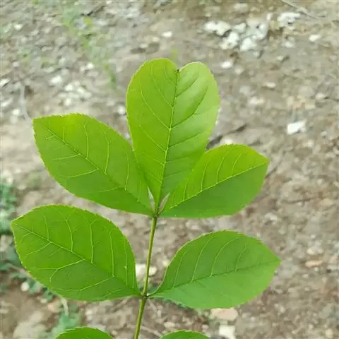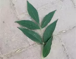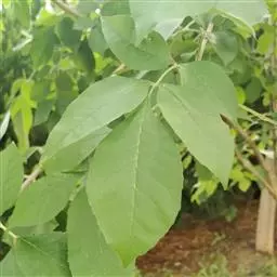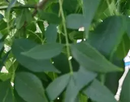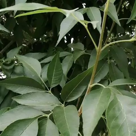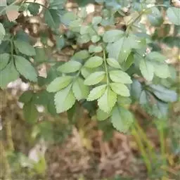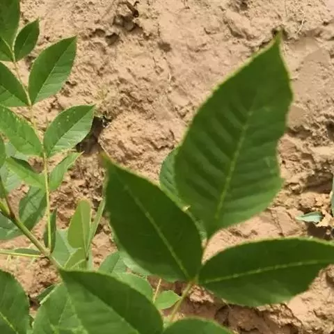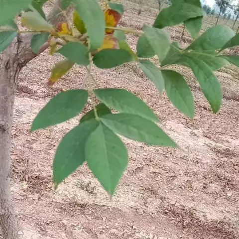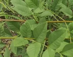 叶:羽状复叶长18-44厘米;叶柄长2-5厘米,基部几不膨大;叶轴圆柱形,上面具较宽的浅沟,密被灰黄色柔毛(变种和一些栽培型常无毛);小叶79枚,薄革质,长圆状披针形、狭卵形或椭圆形,长4-13厘米,宽2-8厘米,顶生小叶与侧生小叶几等大,先端渐尖或急尖,基部阔楔形,叶缘具不明显钝锯齿或近全缘,上面黄绿色,无毛,下面淡绿色,疏被绢毛,脉上较密,中脉在上面凹入,侧脉7-9对,与细脉在下面凸起;小叶无柄或下方1对小叶具短柄。