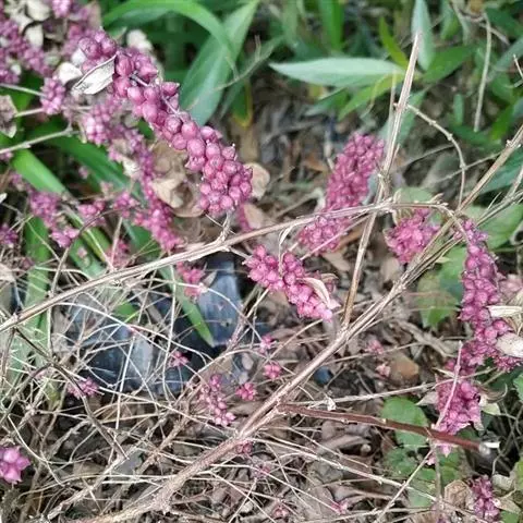 花小,无梗,单生于短小、钻形苞片的腋内,组成一短小的顶生穗状花序,下部的苞片叶状且较长;萼筒长约2毫米,萼齿5枚,卵状披针形,长约1毫米,顶急尖,无毛;花冠白色,钟形,长5-7毫米,裂片卵形,稍短于筒,内外两面均无毛;雄蕊5枚,着生于花冠筒中部,与花冠等长或稍伸出,花药白色,长2毫米;花柱长6-7毫米,无毛,柱头头状。果实卵圆形,长7毫米,顶端有1小喙,蓝黑色,具白霜;分核2枚,密生长柔毛。花期7-9月,果熟期9-11月。