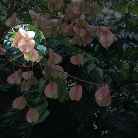 圆锥花序大型,长35-70厘米,分枝广展,与花梗同被短柔毛;萼5裂达中部,裂片阔卵状三角形或长圆形,有短而硬的缘毛及流苏状腺体,边缘呈啮蚀状;花瓣4,长圆状披针形,瓣片长6-9毫米,宽1.5-3毫米,顶端钝或短尖,瓣爪长1.5-3毫米,被长柔毛,鳞片深2裂;雄蕊8枚,长4-7毫米,花丝被白色、开展的长柔毛,下半部毛较多,花药有短疏毛;子房三棱状长圆形,被柔毛。蒴果椭圆形或近球形,具3棱,淡紫红色,老熟时褐色,长4-7厘米,宽3.5-5厘米,顶端钝或圆;有小凸尖,果瓣椭圆形至近圆形,外面具网状脉纹,内面有光泽;种子近球形,直径5-6毫米。花期7-9月,果期8-10月。