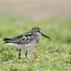阔嘴鹬是涉禽,体长17厘米。特征为翼角常具明显的黑色块斑并具双眉纹。与黑腹滨鹬平滑下弯的嘴相比,…
