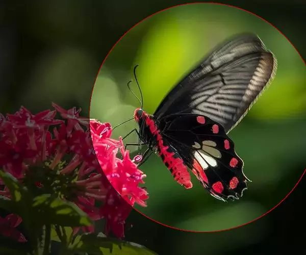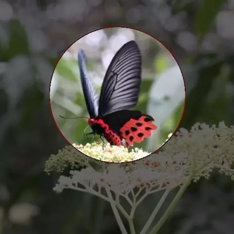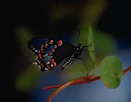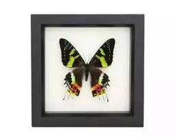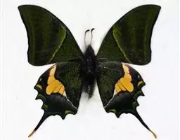 成虫:翅展100—130 mm。 体背黑色,头、颈、胸侧及腹侧具红色鳞毛。雌、雄异型。雄蝶翅黑绒色,后翅的臀缘褶很大,反卷且具灰白色体毛的性标;反面端半部红色,内镶嵌7个黑斑。雌蝶前翅大部及后翅色淡,后翅端半部灰黄色内镶8个黑斑,其中m1室外缘1个不十分清楚;后翅反面端半部浅红色,只镶嵌7个黑斑,因m1室有1个与基半部的黑色相并。
