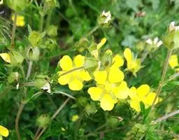 顶生花1-2或2-5朵成聚伞花序,花梗长1-2厘米,密被星状毛及疏柔毛;花直径1.5厘米;萼片三角卵形,顶端急尖,副萼片椭圆形,顶端圆钝稀2裂,外面密被星状毛及疏柔毛;花瓣黄色、倒卵形,顶端微凹或圆钝,比萼片长约1倍;花柱近顶生,基部有乳头,柱头稍微扩大。瘦果近肾形,直径约1毫米,有不明显脉纹。花果期4-8月。