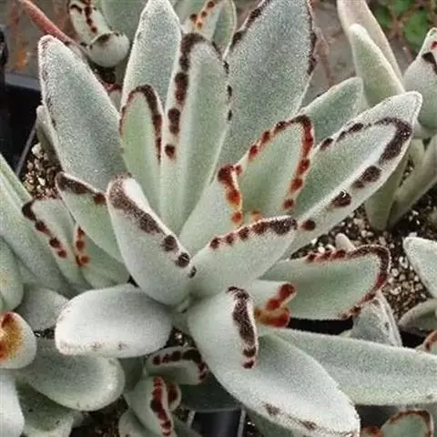 褐斑伽蓝是景天科、伽蓝菜属多年生肉质草本植物或小灌木。全株灰白色,密布白色茸毛。叶片长卵形,…