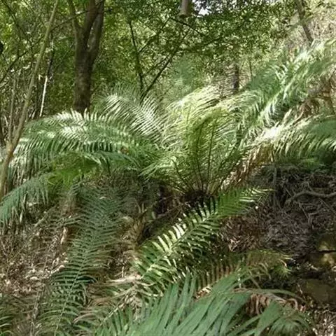 华南苏铁(学名:Cycas rumphii Miq)苏铁科植物。树干圆柱形,上部有残存的叶柄,分枝或不分枝。羽状叶长1-2米,叶轴横切面近圆形或三角状圆形,叶柄长10-15厘米或更长,常具三钝棱,稀无刺;羽状裂片50-80对排成两列,稍弯曲或直, 革质,绿色,有光泽,雄球花有短梗,椭圆状矩圆形,小孢子叶楔形,顶部截状。大孢子叶长20-35厘米,初被绒毛,种子扁圆形或卵圆形,先端有时微凹,中央微有凸尖,花期5-6月,种子10月成熟。
