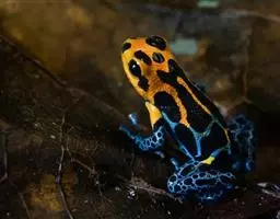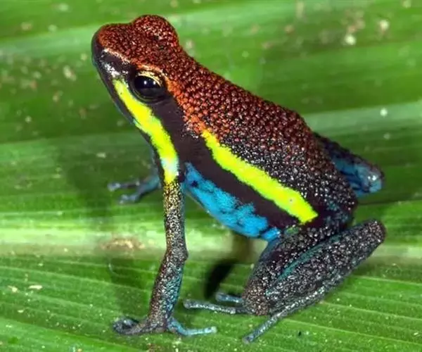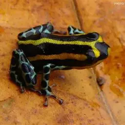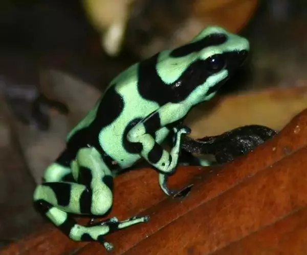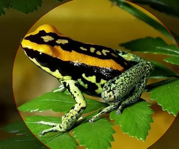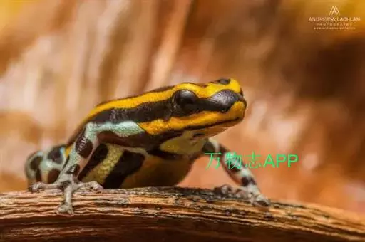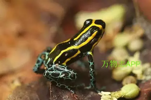 箭毒蛙主要分布于巴西、圭亚那、哥伦比亚和中美洲的热带雨林中,通身鲜明多彩,常为黑与艳红、黄、橙、粉红、绿、蓝的结合,四肢布满鳞纹。其中以柠檬黄最为耀眼和突出。