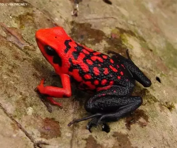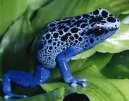 箭毒蛙家族中兰宝石箭毒蛙具有非常高的毒性,它们绚丽的体色使潜在的掠食者远远避开。它们足部没有蹼边不能在水中游动,因此不会出现在水生环境中。