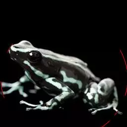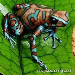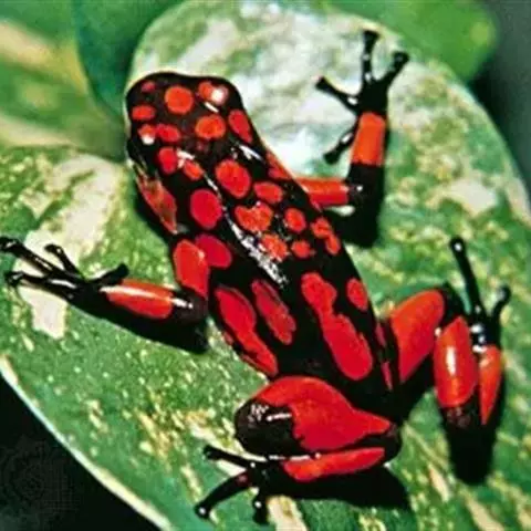 箭毒蛙图片(3) 箭毒蛙体型小,通常长仅1~5公分(0.5~2寸),但非常显眼,颜色为黑与艳红、黄、橙、粉红、绿、蓝的结合。栖居地面或靠近地面,全部属于毒蛙科(Dendrobatidae),但并非所有170种都有毒。箭毒蛙具有某些最强的毒素。这种两栖类身体各处散布的毒腺会产生一些影响神经系统的生物碱。