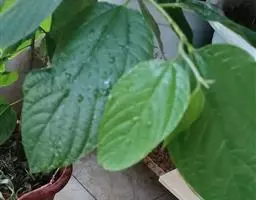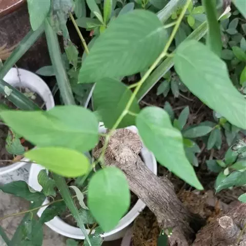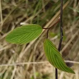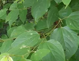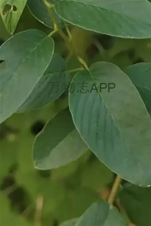 藤状或攀援灌木,高达5米:幼枝无毛,老枝黄褐色,平滑无毛。叶纸质至厚纸质,互生或在短枝顶端簇生,卵状椭圆形或卵状矩圆形,长3-6厘米,宽1.6-3.5厘米,顶端圆形或钝,常有小尖头,基部圆形或近心形,上面绿色,无毛,下面灰白色,仅脉腋被疏微毛,侧脉每边8-10条;叶柄纤细,长1.2-2.6厘米,带红色,无毛。