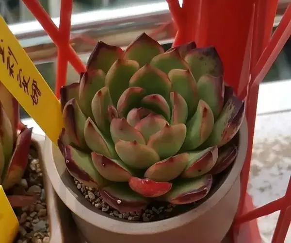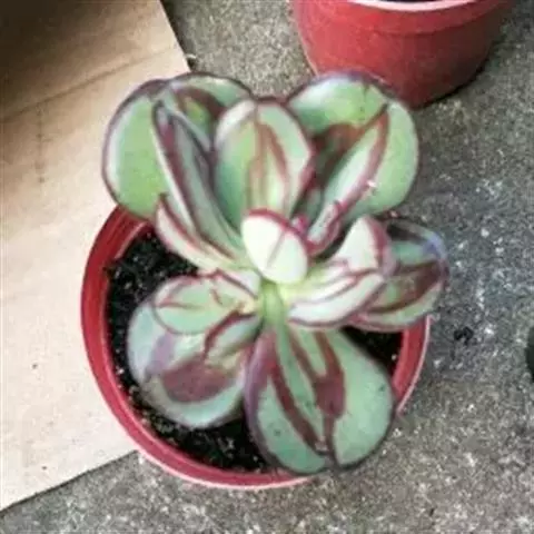 多年生肉质草本植物,又名红边石莲花。叶匙形,植株呈莲座状,叶面浅绿色,叶缘有红边。花期春季至初夏,花小,黄色 。