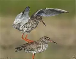 红脚鹬:体长28厘米,上体褐灰,下体白色,胸具褐色纵纹。飞行时腰部白色明显,次级飞羽具明显白色外缘。…