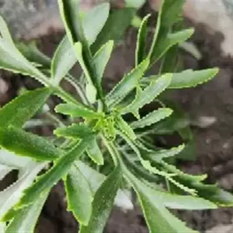 长寿花是常绿多年生草本多浆植物。植株小巧,茎直立,株高10-30厘米。叶对生,叶片密集翠绿,长圆状匙形或椭圆形,长4-8厘米,宽2-6厘米,肉质,叶片上部叶缘具波状钝齿,下部全缘,亮绿色,有光泽,叶边略带红色。叶片属厚肉质,密集深绿,有光泽。