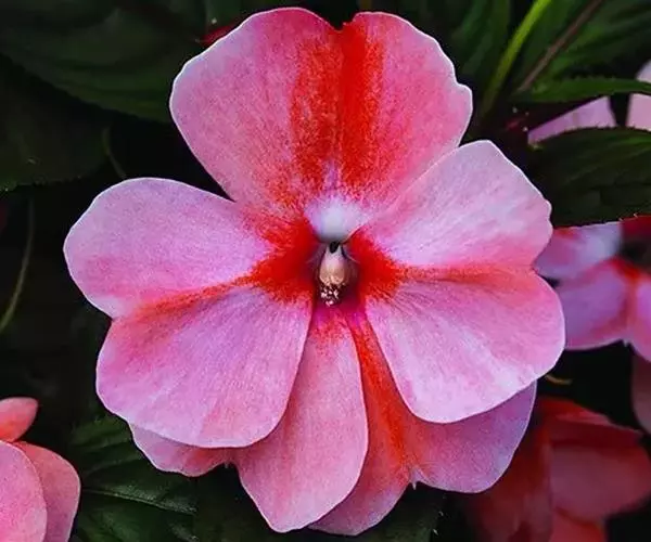 新几内亚凤仙(Impatiens hawkeri W. Bull)多年生常绿草本。茎肉质,分枝多。叶互生,有时上部轮生状,叶片卵状披针形,叶脉红色。花单生或数朵成伞房花序,花柄长,花瓣桃红色、粉红色、橙红色、紫红白色等。花期6--8月。