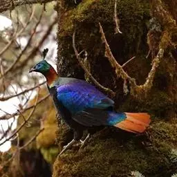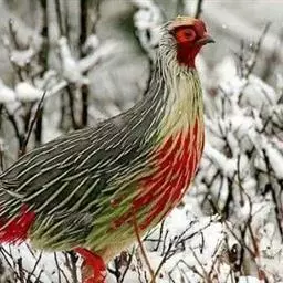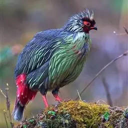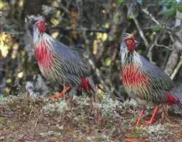 血雉雉科血雉属鸟类,别名血鸡、松花鸡,血雉的雄鸟大覆羽、尾下覆羽、尾上覆羽、脚、头侧、腊膜为红色,…
