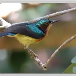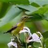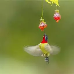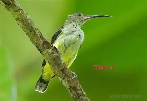 叉尾太阳鸟,雀形目太阳鸟科太阳鸟属留鸟;为小型鸟类,雄鸟头顶辉蓝绿色,上体橄榄绿色,腰明黄色,…