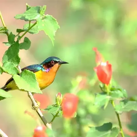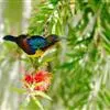 黑胸太阳鸟:小型鸟类,体长9-15厘米。嘴细长而向下曲。雄鸟中央尾羽特长,尾呈楔形,…