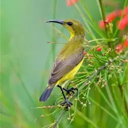 长嘴捕蛛鸟(学名:Arachnothera longirostra),小型鸟类,体长14-16厘米。嘴长而尖向下弯曲。上体橄榄绿色,眼先和短眉灰白色,两翅和尾暗褐色,外翈羽缘橄榄绿色,羽端灰褐色,自嘴基沿喉侧有一黑色纵纹。颏、喉灰白色,其余下体鲜黄色,胸簇羽桔黄色。雌鸟无鲜艳的胸簇羽。常单独或成对活动,很少成群。4-6月是繁殖期。