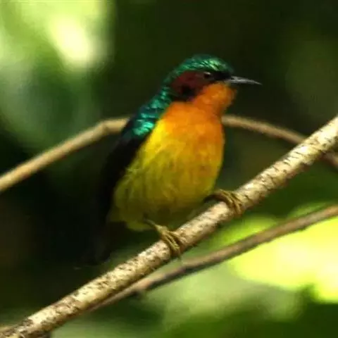 体小而色彩艳丽的太阳鸟。雄鸟:顶冠及上体闪辉深绿色,脸颊深铜红色,腹部黄,喉及胸橙褐。…