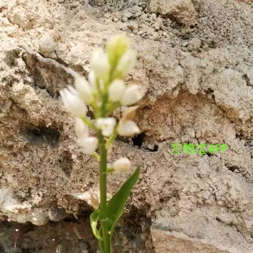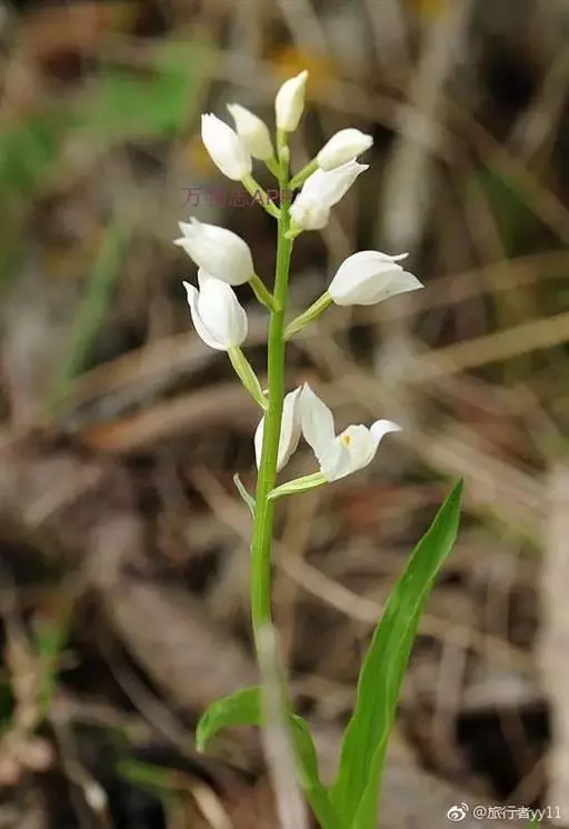 总状花序长1.5-6厘米,具2-13朵花;花苞片线状披针形至狭三角形,长2-6毫米,但最下面1-2枚叶状,长可达5-13厘米;花白色,稍开放或不开放;萼片狭菱状椭圆形或狭椭圆状披针形,长1.1-1.6厘米,宽3.5-4.5毫米,先端渐尖或近急尖,具5脉;花瓣近倒卵形,长7-8毫米,宽约4毫米,先端急尖或具短尖;唇瓣长5-6毫米,3裂,基部具囊;侧裂片近卵状三角形,多少围抱蕊柱;中裂片三角状心形,长3-3.5毫米,宽5-6毫米,上面具3-4条纵褶片,近顶端处密生乳突;唇瓣基部的囊短而钝,包藏于侧萼片基部之内;蕊柱长4-5毫米。