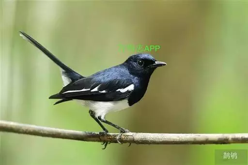 雄性成鸟:头顶至尾上覆羽黑色,略带蓝色金属光泽;飞羽和大覆羽黑褐色,内侧次级飞羽外翈大部和次级覆羽均为白色,构成明显的白色翼斑,其他覆羽与背部同色;中央两对尾羽全黑,外侧第4对尾羽仅内翈边缘黑色,余部均白,其余尾羽都为白色;从颏到上胸部分及脸侧均与头顶同色;下胸至尾下覆羽纯白。