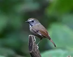 红尾歌鸲:体长13-15厘米。上体橄榄褐色。尾羽棕栗色,眼先和颊黄褐色,眼周淡黄褐色。…