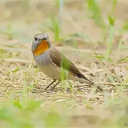 日本歌鸲:体型小似麻雀,但羽毛颜色较为美丽。嘴细长,嘴须不发达;翅短圆,上体草黄褐;雄鸟喉部橙棕色,…