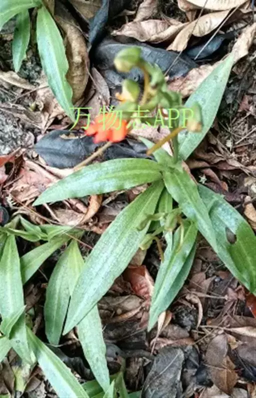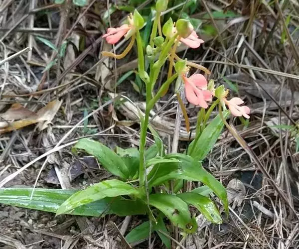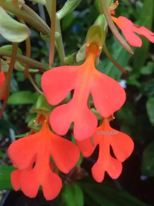 总状花序具2-10余朵疏生的花,长3-8厘米,花茎无毛;花苞片卵状披针形,长1.5-1.7厘米,先端渐尖,短于子房;子房圆柱形,扭转,无毛,连花梗长2-3厘米;花中等大,萼片和花瓣绿色,唇瓣橙黄色、橙红色或红色;中萼片直立,近圆形,凹陷,长约9毫米,宽约8毫米,先端钝,具3脉,与花瓣靠合呈兜状;侧萼片长圆形,长9-10毫米,宽约5毫米,反折,先端钝,具5脉;花瓣直立,匙状线形,长约8毫米,宽约2毫米,先端钝,具1脉;唇瓣向前伸展,轮廓卵形,长1.8-2厘米,最宽处约1.5厘米,4裂,基部具短爪,侧裂片长圆形,长约7毫米,宽约5毫米,先端钝,开展;中裂片2裂,裂片近半卵形,长约4毫米,宽约3毫米,先端为斜截形;距细圆筒状,污黄色,下垂,长2-3厘米,直径约1毫米,末端通常向上弯;蕊喙大,三角形,具延长的臂;柱头2个,隆起,棒状,稍弯曲,长约2.5毫米。