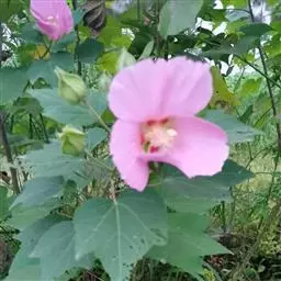 木槿(原变种):落叶灌木,高3-4米,小枝密被黄色星状绒毛。叶菱形至三角状卵形,长3-10厘米,宽2-4厘米,具深浅不同的3裂或不裂,先端钝,基部楔形,边缘具不整齐齿缺,下面沿叶脉微被毛或近无毛;叶柄长5-25毫米,上面被星状柔毛;托叶线形,长约6毫米,疏被柔毛。花单生于枝端叶腋间,花梗长4-14毫米,被星状短绒毛;小苞片6-8,线形,长6-15毫米,宽1-2毫米,密被星状疏绒毛;花萼钟形,长14-20毫米,密被星状短绒毛,裂片5,三角形;花钟形,淡紫色,直径5-6厘米,花瓣倒卵形,长3.5-4.5厘米,外面疏被纤毛和星状长柔毛;雄蕊柱长约3厘米;花柱枝无毛。蒴果卵圆形,直径约12毫米,密被黄色星状绒毛;种子肾形,背部被黄白色长柔毛。花期7-10月。