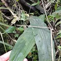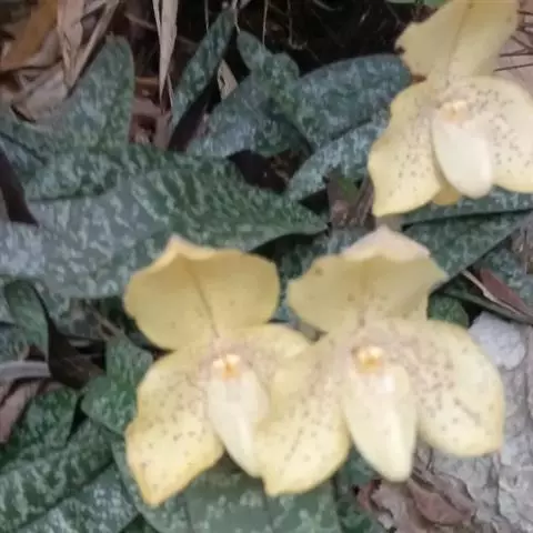 地生或半附生植物,具粗短的根状茎和少数稍肉质而被毛的纤维根。叶基生,二列,4-6枚;叶片狭椭圆形至椭圆状长圆形,长7-18厘米,宽3.5-4.5厘米,先端钝并略有不对称,上面有深浅绿色(或有时略带灰色)相间的网格斑,背面具极密集的紫点或几乎完全紫色,中脉在背面呈龙骨状突起,基部收狭成叶柄状并对折而彼此套叠。