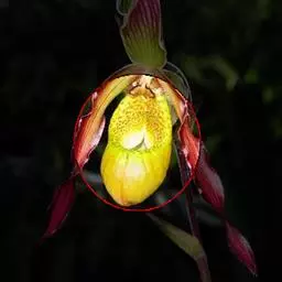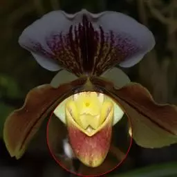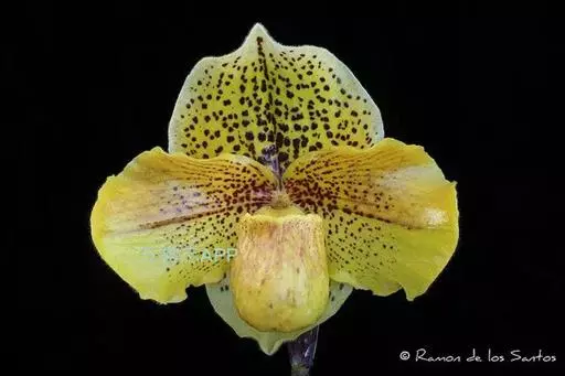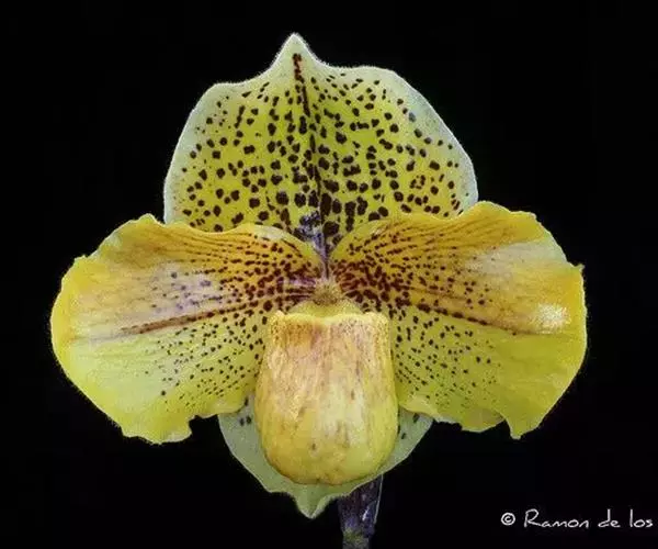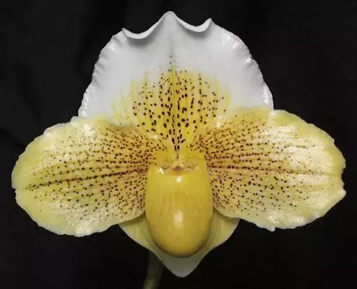 花葶直立,长5-12厘米,紫褐色,被白色短柔毛,顶端通常具1-2花,罕有3花;花苞片宽卵形,长1-2.5厘米,宽1-1.5厘米,先端略钝,背面被短柔毛并有龙骨状突起,边缘具缘毛;花梗和子房长3-4.5厘米,被短柔毛;花直径5-6厘米,淡黄色或罕有近象牙白色,具紫色细斑点;中萼片宽卵形,长2.5-3厘米,宽亦相近,先端钝或急尖,两面均被微柔毛,但上面有时近无毛,边缘多少具缘毛,尤以上部为甚;合萼片与中萼片相似,长宽约2厘米,亦有类似的柔毛;花瓣斜的椭圆形、宽椭圆形或菱状椭圆形,长3-4厘米,宽1.8-2.5厘米,先端钝或近斜截形,近无毛或略被微柔毛;唇瓣深囊状,狭椭圆形至圆锥状椭圆形,长2.5-3厘米,宽约1.5厘米,囊口宽阔,整个边缘内弯,但前方内弯边缘宽仅1-2毫米,基部具短爪,囊底具毛;退化雄蕊宽卵形至宽卵状菱形,长1-1.2厘米,宽8-10毫米,先端略有3小齿,基部收狭并具耳。花期通常6-8月。