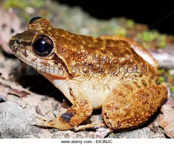 雄蛙体长52毫米,雌蛙68毫米左右;头扁平,宽略大于长;吻端圆.略突出下唇,多数标本在两眼间前中线上有一凸出小白点;吻棱略显,鼻孔位吻眼之间;鼓膜显或可见;犁骨齿弱小.后端间距窄;舌长椭圆形,后端缺刻深。