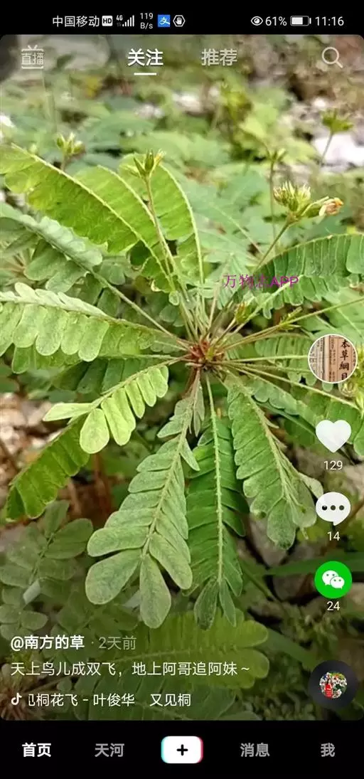 感应草,中药名。为酢浆草科感应草属植物感应草Biophytum sensitivum L.的全草,主要分布于台湾、广东、海南、广西、贵州、云南。具有化痰定喘,消积利水之功效,用于哮喘,小儿疳积,水肿,淋浊。