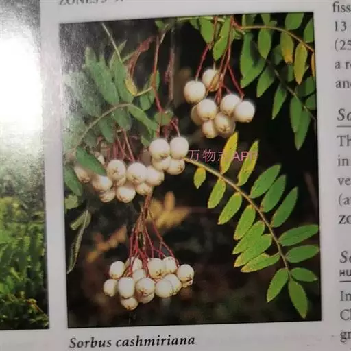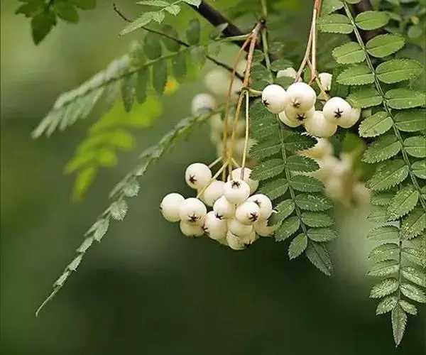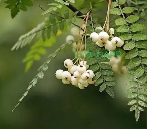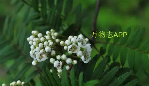 观叶观花观果落叶灌木或小乔木,高达5米,小枝红褐色至灰黑色。冬芽长卵形,外被柔毛。羽状复叶,小叶17~25个,连柄长10~14厘米,小叶近无柄,长圆形至长圆披针形,长1.3~3厘米,宽0.4~1厘米,先端渐尖或钝圆,基部斜楔形,每侧有9~14齿,表面无毛,背面灰绿色,叶轴上有浅沟,两侧有窄翅。叶柄长1~2厘米,托叶圆卵形,早落。复伞房花序,直径4~8厘米,花多数,花直径8~10毫米,萼被疏毛,花瓣卵圆形,4毫米,白色。雄蕊20枚,长为花瓣的1/3,花药褐色,花柱5个,基部具柔毛,与雄蕊等长。果球形,白色,直径6~8毫米,萼片微闭合。