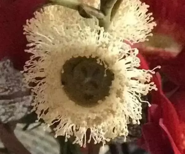 花大,宽4mm,单生或2-3朵聚生于叶腋内;无花梗或极短;萼管倒圆锥形,长1cm,宽1.3cm,表面有4条突起棱角和小瘤状突,被白粉;帽状体稍扁平,中部为圆锥状突起,比兽管短,2层,外层平滑,早落;雄蕊长8-13mm,多列,花丝纤细,花药椭圆形;花柱长7-8mm,粗大。