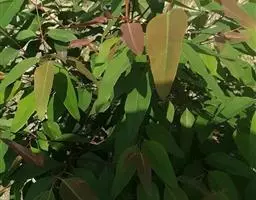 幼态叶对生,叶片卵形,基部心形,无柄,有白粉;成长叶片革质,披针形,镰状,长15-30cm,宽1-2cm,两面有腺点,侧脉不很明显,以35°-40°开角斜行,边脉离边缘1mm;叶柄长1.5-3cm,稍扁平。